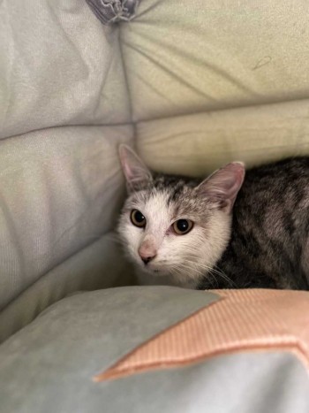 Der kastrierte Kater ist grau getigert mit weiß, ca. schätzungsweise 1 bis 2 Jahre alt, hat ein Chip