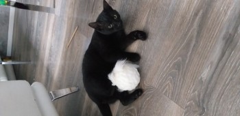 Schwarze Katze. Ziemlich klein mit dunkel grün Halsband.