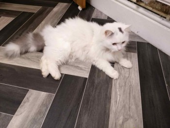 A white male cat with a gray tail and a small gray/black spot on his head.