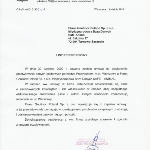 W dniu 30 czerwca 2009 r. zawarta została umowa na powierzenie przetwarzania danych osobowych pomiędzy Prezydentem m.st. Warszawy a Firmą Geulincx Poland Sp. z o.o. Międzynarodowa Baza Danych SAFE-ANIMAL.