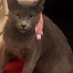 Szara w pręgi, posiada czarną obrożę z dzwoneczkiem.