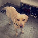 Wysokość psa do kolana, w miarę szczupły, wabi się Labi, przyjazny do ludzi.