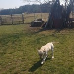 Sunia niezbyt duża, niespełna do kolana, biała w łaty brązowo - czarne. Na szyi ma obrożę elektryczną.