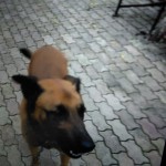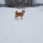 Mieszaniec owczarka niemieckiego. Samica reaguje na imię Margo. Ma czerwoną obrożę.