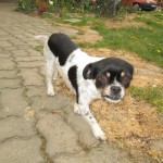 Imię Jager. Wiek 6 miesięcy. Biały z brązowymi plamami na tyle i głowie. Krzywy paznokieć w lewej łapie. Ciemne plamki na skórze