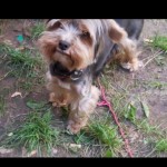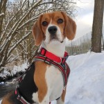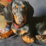 Pies ma na imię Dennis jest w umaszczeniu biszkoptowym na szyi ma czerwoną obroże.