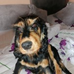 Piesek jest młody, ma 7-8 miesięcy. Białe łapki z przodu, biały szalik, białe czoło i pyszczek. Reszta czarna. Ogon na końcu biały. Bardzo towarzyski, przyjazny i ruchliwy. Lubi zabawę oraz gonitwę za patykiem. Podchodzi do ludzi i skacze na nich.