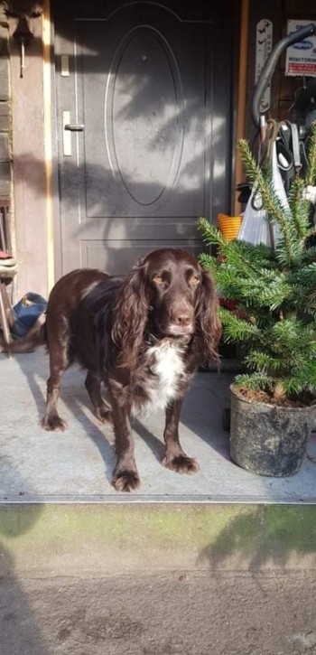 Saba, suczka rasy Wachtelhund, umaszczenie brązowe z białą krawatką, sierść półdługa falista, lekka nadwaga