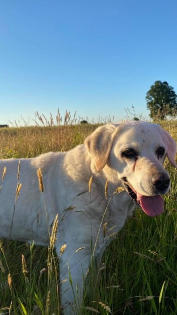 Zaginęła wieczorem 05.08.21 Biszkoptowa prawie biała sunia Labrador, bardzo łagodna, tatuaż na uchu nr A/621, charakterystyczna niewielka narośl czarna na pysku, Wabi się Tesi ma 13 lat!