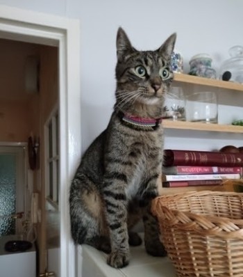 Szary pręgowany. półtoraroczny kot z zielonymi oczami o imieniu Gimzio. Kot nie ma na szyi obróżki.