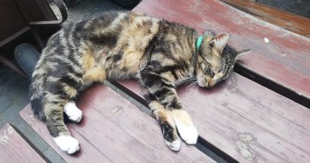 ma zieloną obrażą zielona, białe umaszczenie na łapkach jak sparpetki