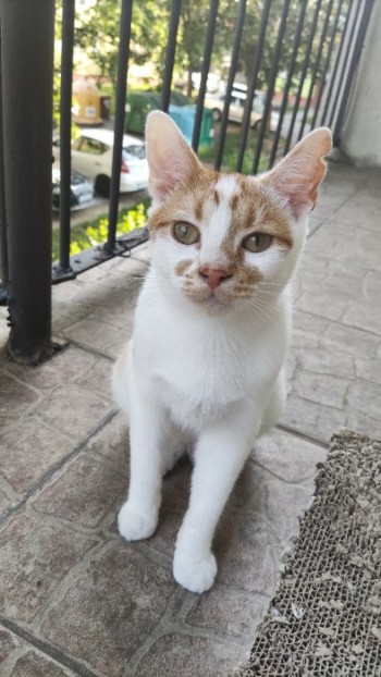 Kotka biała w rude łatki, ma charakterystyczne naderwane lewe uszko, jest trochę płochliwa