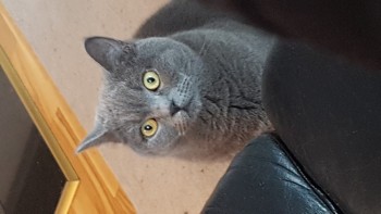 Szary kotek z dużymi oczkami, jest nieufny i plochliwy