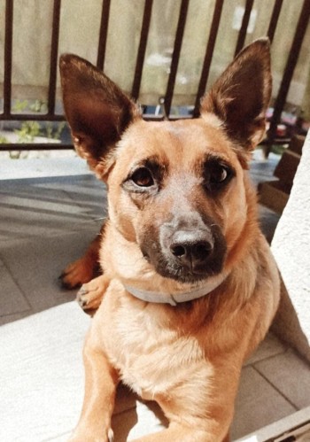 Niewielki kundelek (suczka) o wyglądzie przypominającym wilczura - sierść krótka i gładka, jasnobrązowa, przetykana czarnymi włosami. Oczy brązowe, duże stojące uszy. Przycięty ogon. Szara obroża przeciwpchelna z czerwoną zawieszką z nr kontaktowymi.