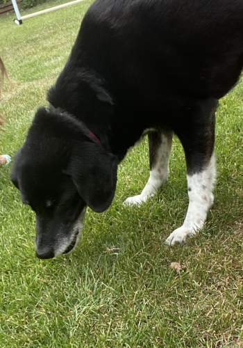 Starszy kundel, czarny z białym podbrzuszem i przednimi łapami + czerwona obroża.
