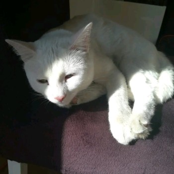 cała biała kotka, jedno oko niebieskie, a drugie zielone, wiek: 3 lata, do obcych jest nieufna