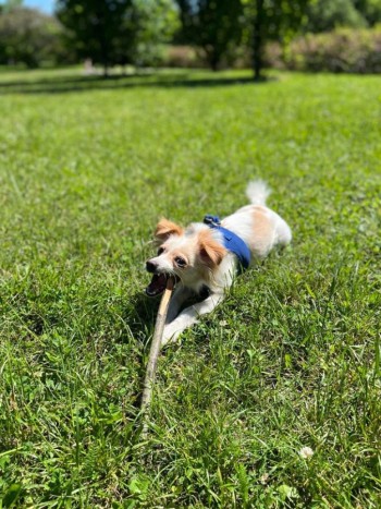 Biały, z kremowymi plamami, długie włosie, do okład ma niebieskie szelki. Powinien reagować na imie Cheetos