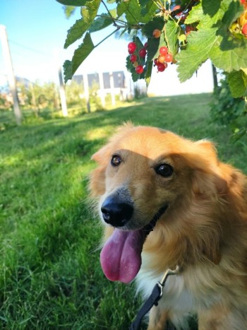 pies do kolana, rudy, długie włosy, ma brązową obrożę