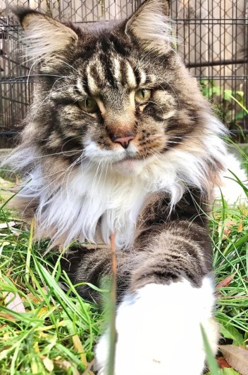 Duży, puszysty, bury kot z białym brzuchem, kołnierzem i białymi końcami łap.