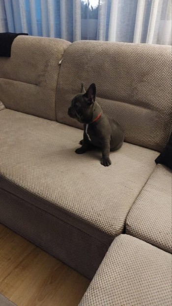 Buldog francuski umaszczenie blue, biały krawat na szyji