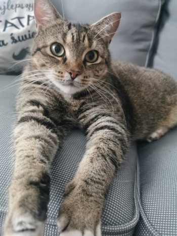 Szara kotka, biały brzuch i łapki, dość gruba, wysterylizowana. Reaguje na imię Ozi, niestety boi sie obcych.