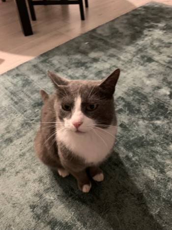 Szaro biały kot bardzo podobny do rasy brytyjskiej, wiek ok 6 lat, duży, na imię ma Puszek