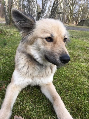 Średniej wielkości suczka z dłuższa jasna podpalana sierścią ma na imię Sarenka