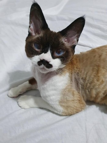 Devon rex o umaszczeniu czarny point. Jasperek ma niebieskie oczy (prawe mniejsze, łzawi po operacji). Kot jest alergikiem, więc bez leków będzie kichał i miał katar. Charakterystyczna czarma plama pod nosem przypominająca wąsy. Sierść krótka kręcona.