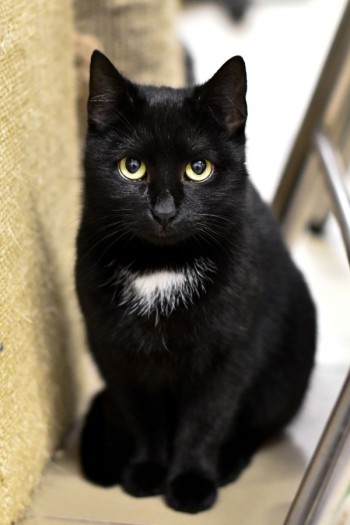 Czarny kot z białą plamą, tzw. krawacik i białą plamą pomiędzy tylnymi łapami.