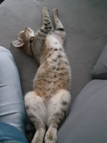 Jest to młoda kotka, pręgowana, na szyi ma kolorową obróżkę
