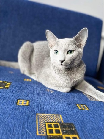 Kotek przyjazny, maści szarej z zielonymi oczami.