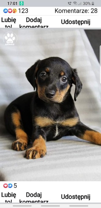 Maly ,czarno brazowa masc , podobny do szczeniaka dobermana, jest to roczny pies nie grozny.