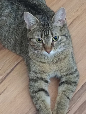 Bura kotka, reaguje na imię Madzia. Ma na łopatce białą łysą plamkę.
