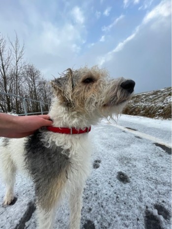 Średniej wielkości, biały w czarne plamki, szara obroża antykleszczowa
