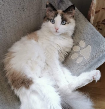Młoda, około roczna kotka o umaszczeniu białym w szaro-brązowe plamy, między innymi na uszach. Charakteryzuje się błękitnymi oczami oraz długą i puszystą sierścią, zwłaszcza na ogonie.