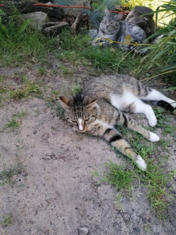Kotka bura pręgowana z biały. Znak szczególny biała sierść na nosku. Wabi się Drahma