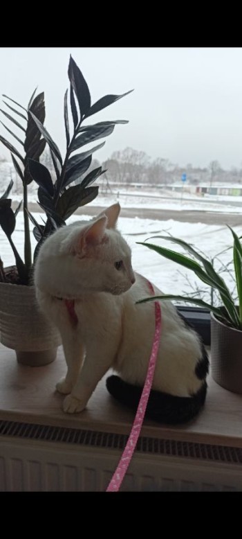 Kotka jest biała ma czarny ogon i z tyłu plamki w kształcie serca
