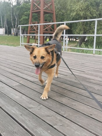 Kolor podpalany(rudo-czarny), szara, cienka obroża na kleszcze, wysokość trochę ponad kolano, waga 25 kg, wabi się Misiek
