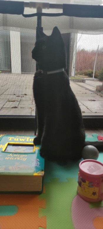Kot bardzo przyjacielski, koloru czarnego, na szyi niebieska obróżka świecąca w ciemności.