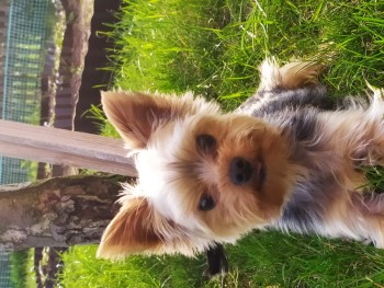 Biały łepek, srebrno-czarny grzbiet, złote łapki,prosty włos. Ma 3 lata.
