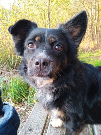Nela ma ok 8 lat. Jest spokojnym i przyjacielskim psem. Jest niska. Maść czarna podpalana. Ma jedno oklapnięte ucho i nie ma przedniego lewego zęba.