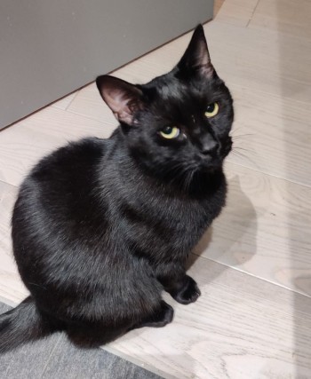 Kot Joda, cały czarny z jedną małą białą centką na grzbiecie przy barku. Przyjacielski, ciekawski.