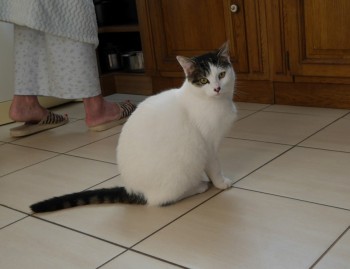 Biała z burym ogonem i łepkiem. Charakterystyczną czarną plamką na nosie.