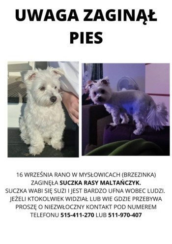 Biały, mały maltańczyk, uciekła z domu ranem 16 września. Ufna wobec obcych.