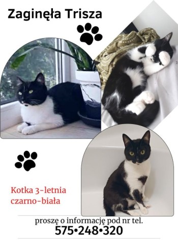 czarno-biała kotka. Trisza. ma 4 lata. brzusek białyj z ciemną plamą na piersi. czarna głowa z białym podbródkiem. przednie łapy i tył są czarne