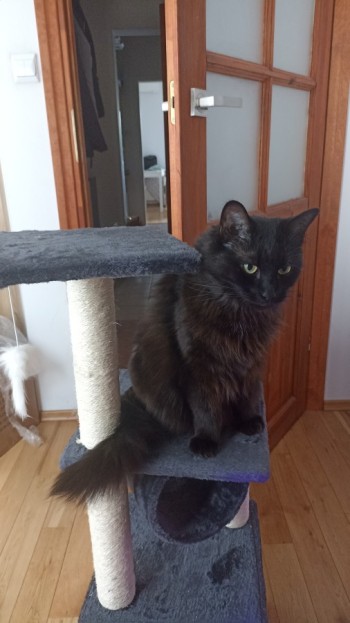 Black furry cat, eyes yellow/green depending on the lighting. Weight 4-5 kg