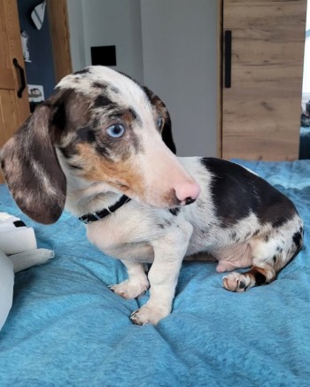 Pies jest malutki, ma charakterystyczne łatki i niebieskie oczy