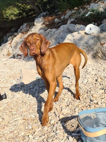 młoda suka, szczupła, z ubytkami sierści z powodu choroby