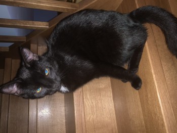 Czarny, biała plamka/muszka na szyi, oczy brązowo zielone