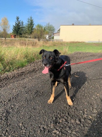 Psinka czarna z podpalanymi łapkami, oklapnięte uszka, czerwona obroża